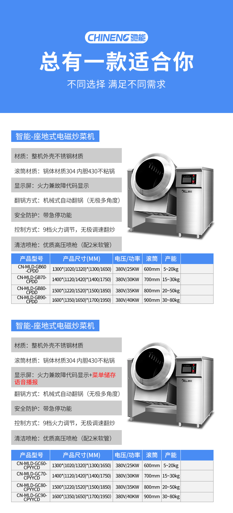 翻鍋方式:機(jī)械式自動(dòng)翻鍋(無極多角度)+菜單儲(chǔ)存語音播報(bào)